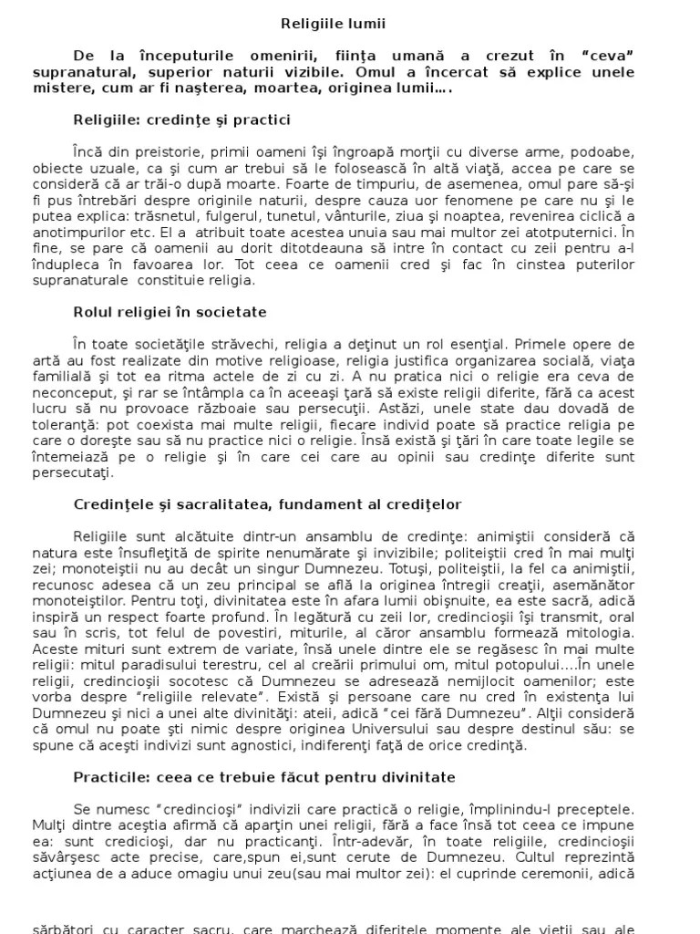 Yoga, meditatiile si recitarea din carti religioase... Pentru aceasta religie nu avem o persoana sau un … Religia este un subiect important in lume si ne influenteaza pe toti. Religiile lumii de jean delumeau. Sunt reprezentate astfel toate marile religii ale omenirii: Dacă îți dorești să citești cartea integral folosește butoanele de mai jos pentru a naviga la librăriile online care comercializează cartea religiile lumii în format fizic... Cartea noastră poate fi, prin urmare, comparată cu o masă rotundă unde fiecare se află pe picior de egalitate cu partenerii săi.