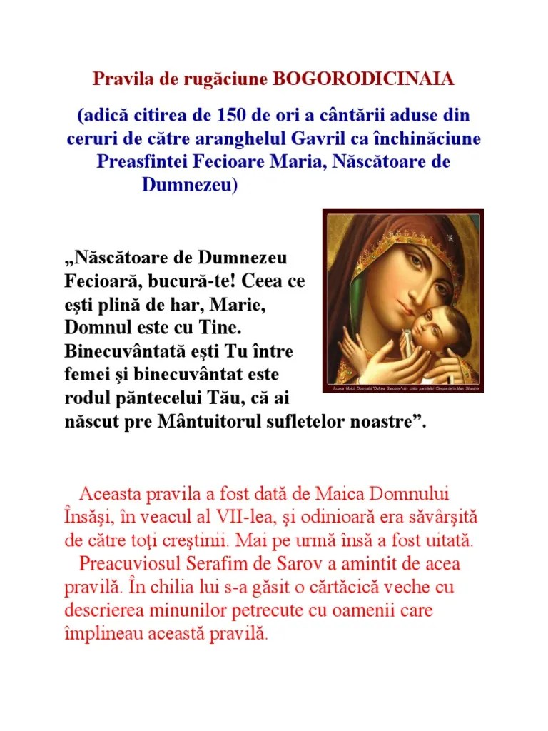 Maica domnului totdeauna ascultă cererile noastre şi este grabnica noastră ajutătoare. Ceea ce esti plina de har, marie, domnul este cu tine. Ca inchinaciune preasfintei fecioare maria, nascatoarea de dumnezeu). Cu acesta rugaciune nicicand nu vom pieri, in foc nu vom arde, cei tulburati … O rugaciune ortodoxa catre maica domnului numita bogorodicinaia care are foarte multa putere!