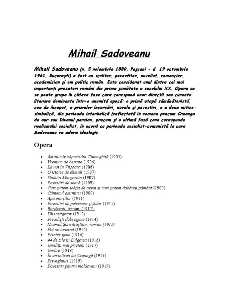 Opera literara, literatura proletcultista si monografiile critice scrise de mihail sadoveanu. In timp ce studia la gimnaziu, in 1896, intentioneaza sa alcatuiasca, impreuna cu un coleg, o monografie asupra lui stefan cel mare, renuntand, insa, din lipsa de izvoare. Sadoveanu, fiu de ran tiutor de carte, din inuturile gorjului, cu profira ursachi, fiic de rzei din satul vereni, de pe apa moldovei de sus. În coala primar din vatra pacanilor îl. Urmeaza gimnaziul alecu donici la falticeni... Nascut la 5 noiembrie 1880 la pascani ;